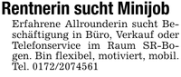 Rentnerin sucht MinijobErfahrene Allrounderin sucht Beschäftigung in Büro, Verkauf oder Telefonservice im Raum SR-Bogen. Bin flexibel, motiviert, mobil. Tel. ***
