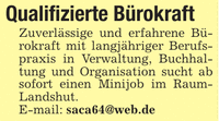 Qualifizierte Bürokraft Zuverlässige und erfahrene Bürokraft mit langjähriger Berufspraxis in Verwaltung, Buchhaltung und Organisation sucht ab sofort einen Minijob im RaumLandshut. E-mail: saca64@web.de