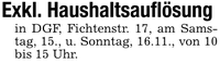 Exkl. Haushaltsauflösung in DGF, Fichtenstr. 17, am Samstag, 15., u. Sonntag, 16.11., von 10 bis 15 Uhr.