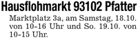 Hausflohmarkt 93102 PfatterMarktplatz 3a, am Samstag, 18.10. von 10-16 Uhr und So. 19.10. von 10-15 Uhr.