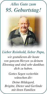 Lieber Reinhold, lieber Papa, wir gratulieren dir heute von ganzem Herzen zu deinem Ehrentag und sind sehr dankbar, dich zu haben. Gottes Segen weiterhin wünschen dir: Deine Hildegard, Brigitte, Dieter und Gerlinde mit ihren Familien Alles Gute zum 95. Geburtstag!