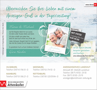* Abbildungen in Originalgröße _ Preise inkl. MwSt.Jetzt auch online bequem gestalten und buchen: anz.idowa.de/herzlicheAnzeigenservice Landshut Altstadt *** Landshut Telefon: *** Fax: *** anzeigen@landshuter-zeitung.deVilsbiburg Telefon: *** Mainburg Telefon: ***Moosburg Telefon: *** Rottenburg Telefon: ***-spaltig/50 mm EUR 59,50MIT FOTO!BEISPIEL*
