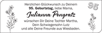 Herzlichen Glückwunsch zu Deinem 95. Geburtstag, liebe Mama, Julianna Pongratz wünschen Dir Deine Tochter Martha, Dein Schwiegersohn Lutz und alle Deine Freunde aus Wiesbaden. 95