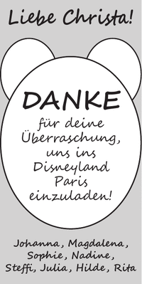 DANKE für deine Überraschung, uns ins Disneyland Paris einzuladen!Liebe Christa!Johanna, Magdalena, Sophie, Nadine, Steffi, Julia, Hilde, Rita