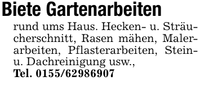 Biete Gartenarbeitenrund ums Haus. Hecken- u. Sträucherschnitt, Rasen mähen, Malerarbeiten, Pflasterarbeiten, Stein- u. Dachreinigung usw.,Tel. ***