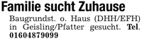 Familie sucht ZuhauseBaugrundst. o. Haus (DHH/EFH) in Geisling/Pfatter gesucht. Tel. ***