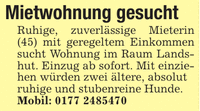 Mietwohnung gesucht Ruhige, zuverlässige Mieterin (45) mit geregeltem Einkommen sucht Wohnung im Raum Landshut. Einzug ab sofort. Mit einziehen würden zwei ältere, absolut ruhige und stubenreine Hunde. Mobil: ***