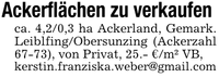 Ackerflächen zu verkaufen ca. 4,2/0,3 ha Ackerland, Gemark. Leiblfing/Obersunzing (Ackerzahl 67-73), von Privat, 25.- €/m² VB,kerstin.franziska.weber@gmail.com
