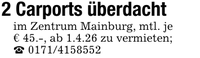 2 Carports überdachtim Zentrum Mainburg, mtl. je€ 45.-, ab 1.4.26 zu vermieten;_ ***