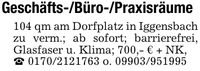 Geschäfts-/Büro-/Praxisräume104 qm am Dorfplatz in Iggensbach zu verm.; ab sofort; barrierefrei, Glasfaser u. Klima; 700,- € + NK,_ *** o. ***