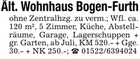 Ält. Wohnhaus Bogen-Furthohne Zentralhzg. zu verm.; Wfl. ca. 120 m², 5 Zimmer, Küche, Abstellräume, Garage, Lagerschuppen + gr. Garten, ab Juli, KM 520.- + Gge. 30.- + NK 250.-; _ ***