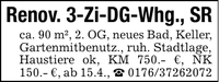 Renov. 3-Zi-DG-Whg., SRca. 90 m², 2. OG, neues Bad, Keller,Gartenmitbenutz., ruh. Stadtlage,Haustiere ok, KM 750.- €, NK 150.- €, ab 15.4., _ ***