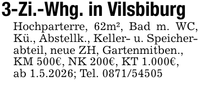 3-Zi.-Whg. in VilsbiburgHochparterre, 62m², Bad m. WC, Kü., Abstellk., Keller- u. Speicherabteil, neue ZH, Gartenmitben.,KM 500€, NK 200€, KT 1.000€,ab 1.5.2026; Tel. ***