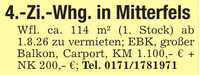 4.-Zi.-Whg. in Mitterfels Wfl. ca. 114 m² (1. Stock) ab 1.8.26 zu vermieten; EBK, großer Balkon, Carport, KM 1.100,- € + NK 200,- €; Tel. ***