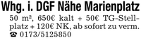 Whg. i. DGF Nähe Marienplatz 50 m², 650€ kalt + 50€ TG-Stellplatz + 120€ NK, ab sofort zu verm. _ ***