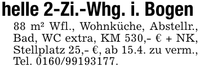 helle 2-Zi.-Whg. i. Bogen88 m² Wfl., Wohnküche, Abstellr., Bad, WC extra, KM 530,- € + NK, Stellplatz 25,- €, ab 15.4. zu verm., Tel. ***.