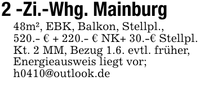 2 -Zi.-Whg. Mainburg48m², EBK, Balkon, Stellpl., 520.- € + 220.- € NK+ 30.-€ Stellpl.Kt. 2 MM, Bezug 1.6. evtl. früher,Energieausweis liegt vor;h0410@outlook.de