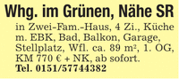 Whg. im Grünen, Nähe SRin Zwei-Fam.-Haus, 4 Zi., Küche m. EBK, Bad, Balkon, Garage,Stellplatz, Wfl. ca. 89 m2, 1. OG, KM 770 € + NK, ab sofort.Tel. ***