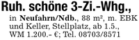 Ruh. schöne 3-Zi.-Whg., in Neufahrn/Ndb., 88 m², m. EBK und Keller, Stellplatz, ab 1.5.,WM 1.200.- €; Tel. ***