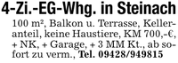 4-Zi.-EG-Whg. in Steinach100 m², Balkon u. Terrasse, Kelleranteil, keine Haustiere, KM 700,-€, + NK, + Garage, + 3 MM Kt., ab sofort zu verm., Tel. ***