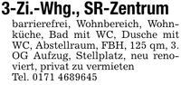 3-Zi.-Whg., SR-Zentrum barrierefrei, Wohnbereich, Wohnküche, Bad mit WC, Dusche mit WC, Abstellraum, FBH, 125 qm, 3. OG Aufzug, Stellplatz, neu renoviert, privat zu vermietenTel. ***