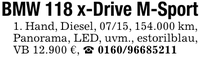 BMW 118 x-Drive M-Sport1. Hand, Diesel, 07/15, 154.000 km, Panorama, LED, uvm., estorilblau, VB 12.900 €, _ ***