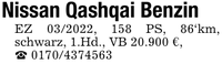 Nissan Qashqai BenzinEZ ***, 158 PS, 86'km, schwarz, 1.Hd., VB 20.900 €,_ ***