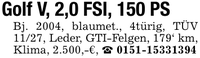 Golf V, 2,0 FSI, 150 PSBj. 2004, blaumet., 4türig, TÜV 11/27, Leder, GTI-Felgen, 179' km, Klima, 2.500,-€, _ ***