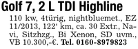 Golf 7, 2 L TDI Highline110 kw, 4türig, nightbluemet., EZ ***, 122' km, ca. 30 Extr., Navi, Sitzhzg., Bi Xenon, SD uvm., VB 10.300,-€. Tel. ***