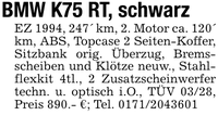 BMW K75 RT, schwarzEZ 1994, 247' km, 2. Motor ca. 120' km, ABS, Topcase 2 Seiten-Koffer, Sitzbank orig. Überzug, Bremsscheiben und Klötze neuw., Stahlflexkit 4tl., 2 Zusatzscheinwerfer techn. u. optisch i.O., TÜV 03/28, Preis 890.- €; Tel. ***