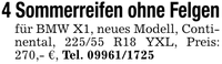 4 Sommerreifen ohne Felgenfür BMW X1, neues Modell, Continental, 225/55 R18 YXL, Preis: 270,- €, Tel. ***