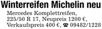 Winterreifen Michelin neuMercedes Komplettreifen, 225/50 R 17, Neupreis 1200 €,Verkaufspreis 400 €, _ ***