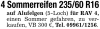 4 Sommerreifen 235/60 R16auf Alufelgen (5-Loch) für RAV 4, einen Sommer gefahren, zu verkaufen, VB 300 €, Tel. ***.