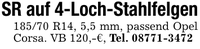 SR auf 4-Loch-Stahlfelgen185/70 R14, 5,5 mm, passend Opel Corsa. VB 120,-€, Tel. ***