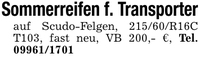 Sommerreifen f. Transporterauf Scudo-Felgen, 215/60/R16C T103, fast neu, VB 200,- €, Tel. ***