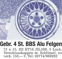 Gebr. 4 St. BBS Alu Felgen 7J x 15, H2 ET18 JIL389, 5 Loch, Verschlusskappen m. Schlüssel, zu verk. 150,-- €, Tel: ***