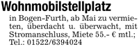 Wohnmobilstellplatz in Bogen-Furth, ab Mai zu vermieten, überdacht u. überwacht, mit Stromanschluss, Miete 55.- € mtl.;Tel.: ***