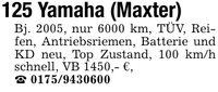 125 Yamaha (Maxter)Bj. 2005, nur 6000 km, TÜV, Reifen, Antriebsriemen, Batterie und KD neu, Top Zustand, 100 km/h schnell, VB 1450,- €,_ ***