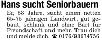 Hans sucht Seniorbauern Er, 58 Jahre, sucht einen netten 65-75 jährigen Landwirt, gut gebaut, schlank und ohne Bart für Freundschaft und mehr. Trau dich und melde dich. _ ***