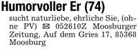 Humorvoller Er (74)sucht naturliebe, ehrliche Sie, (ohne PV) _ ***Z Moosburger Zeitung, Auf dem Gries 17, 85368 Moosburg