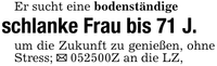 Er sucht eine bodenständigeschlanke Frau bis 71 J.um die Zukunft zu genießen, ohne Stress; _ ***Z an die LZ,
