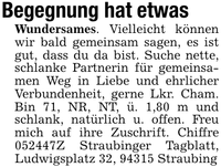 Begegnung hat etwas Wundersames. Vielleicht können wir bald gemeinsam sagen, es ist gut, dass du da bist. Suche nette, schlanke Partnerin für gemeinsamen Weg in Liebe und ehrlicher Verbundenheit, gerne Lkr. Cham. Bin 71, NR, NT, ü. 1,80 m und schlank, natürlich u. offen. Freu mich auf ihre Zuschrift. Chiffre ***Z Straubinger Tagblatt, Ludwigsplatz 32, 94315 Straubing