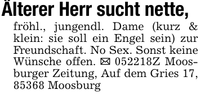 Älterer Herr sucht nette,fröhl., jungendl. Dame (kurz & klein: sie soll ein Engel sein) zur Freundschaft. No Sex. Sonst keine Wünsche offen. _ ***Z Moosburger Zeitung, Auf dem Gries 17, 85368 Moosburg