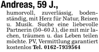 Andreas, 59 J.,humorvoll, zuverlässig, bodenständig, mit Herz für Natur, Reisen u. Musik. Suche eine liebevolle Partnerin (50-60 J.), die mit mir lachen, träumen u. das Leben teilen möchte. PV, Vermittlung garantiert kostenlos Tel. ***