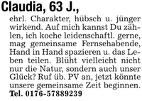 Claudia, 63 J.,ehrl. Charakter, hübsch u. jünger wirkend. Auf mich kannst Du zählen, ich koche leidenschaftl. gerne, mag gemeinsame Fernsehabende, Hand in Hand spazieren u. das Leben teilen. Blüht vielleicht nicht nur die Natur, sondern auch unser Glück? Ruf üb. PV an, jetzt könnte unsere gemeinsame Zeit beginnen. Tel. ***