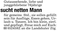 Gutaussehende, liebe undjunggebliebene 76jährige sucht netten Mannfür gemeins. Std., sie sollen gefüllt sein für Ausflüge, Essen gehen, Urlaub u. Tanzen. Ich bin klein, zierl. und gepflegt; Freue mich auf Euch:_ ***Z an die Landshuter Ztg.
