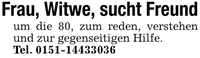 Frau, Witwe, sucht Freundum die 80, zum reden, verstehen und zur gegenseitigen Hilfe.Tel. ***