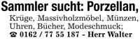 Sammler sucht: Porzellan,Krüge, Massivholzmöbel, Münzen, Uhren, Bücher, Modeschmuck; _ *** - Herr Walter