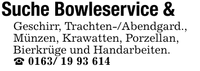 Suche Bowleservice &Geschirr, Trachten-/Abendgard.,Münzen, Krawatten, Porzellan,Bierkrüge und Handarbeiten. ***