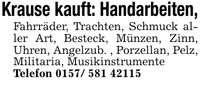 Krause kauft: Handarbeiten, Fahrräder, Trachten, Schmuck aller Art, Besteck, Münzen, Zinn, Uhren, Angelzub. , Porzellan, Pelz, Militaria, Musikinstrumente Telefon ***